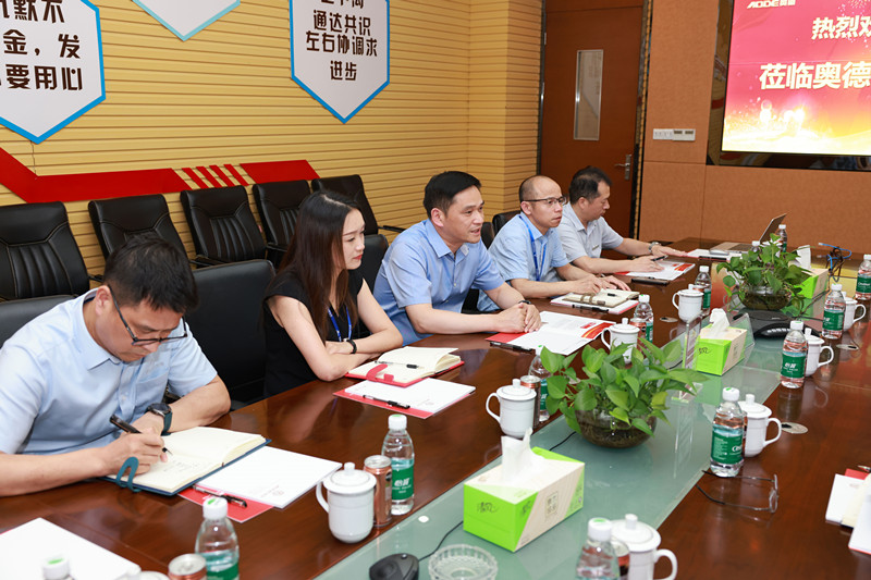 管书记一行参观完奥德展厅后,在奥德会议室进行了座谈交流,奥德公司从主要业务、规模增长、资本运作、核心优势等方面做了详细介绍,并获得了管书记一行的肯定,管书记在仔细询问奥德上市工作进展时,并就奥德上市过程中遇到的问题进行了回应。